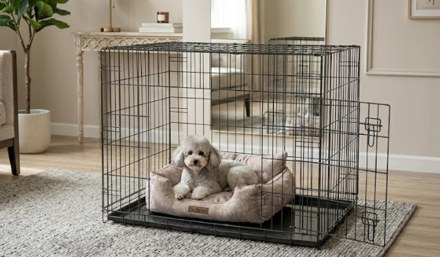Это важно для того, чтобы собака могла расслабиться и чувствовать себя в безопасности в своем укромном месте. Также настоятельно рекомендуется использовать видеокамеру, чтобы в отсутствие владельца можно было наблюдать за питомцем. Это особенно важно, так как нередко собаки испытывают стресс, оставаясь одни. Чаще всего это связано с неправильным приучением к вольеру или клетке: из-за плотного графика у владельцев не всегда есть возможность уделить достаточно времени формированию у собаки навыка спокойного нахождения в одиночестве.