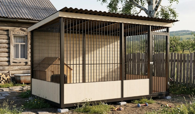 Этот вариант станет надежным домом для крупных собак, обеспечивая им свободу движений и комфорт на свежем воздухе. Каркас выполнен из профильной трубы, стены и напольный щит устойчивы и прочны, крыша из профильного листа защищает питомца от дождя и снега. По нижнему краю стен есть щиты, которые в жару будут создавать небольшую тень, а в непогоду защищать от ветра. Будки в базовой комплектации нет, но можно заказать как дополнительную опцию — за отдельную сумму.