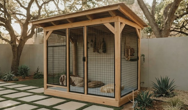 Уличный вольер должен иметь защиту от сквозняков, прямого солнечного света и дождя, а также иметь безопасное покрытие пола, которое предотвращает скольжение и травмы лап.