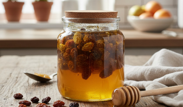 Сухой изюм переберем, зальем на 3-5 минут кипятком. Затем обсушим в сите и измельчим блендером. Полученную массу смешаем с медом, разложим по банкам и уберем в холодильник.