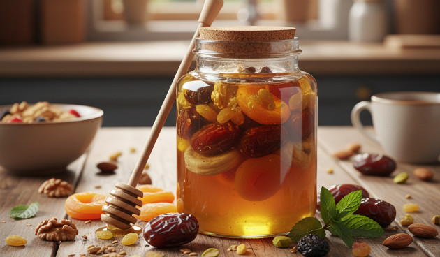 Сухофрукты ошпарим кипятком, просушим бумажным полотенцем и измельчим в мясорубке. Смешаем с медом, разложим по банкам. Храним в холодильнике.