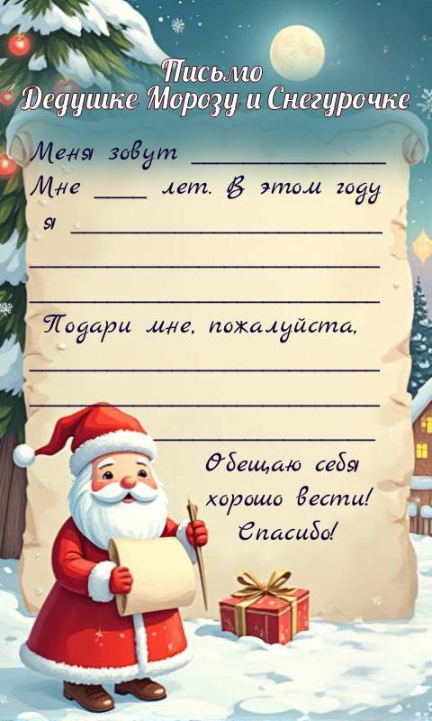 | Какой текст написать? | 1. Вначале поздоровайтесь. 2. Затем расскажите немного о себе: имя, возраст, город. 3. Опишите, как вы провели год и как себя вели. 4. Можно поблагодарить за прошлогодние подарки. 5. Поделитесь целями, идеями, планами и мечтами. 6. Поблагодарите, пожелайте здоровья и счастья в новом году, не стесняйтесь добавлять что-то от души. |