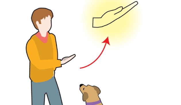 Когда собака перестанет вскакивать до момента получения лакомства, переходите к третьему этапу. Вместе с озвучиванием команды показывайте ее жестом (см. рисунок). Считается, что команда выучена, когда собака начинает выполнять ее на расстоянии 2 – 3 м.