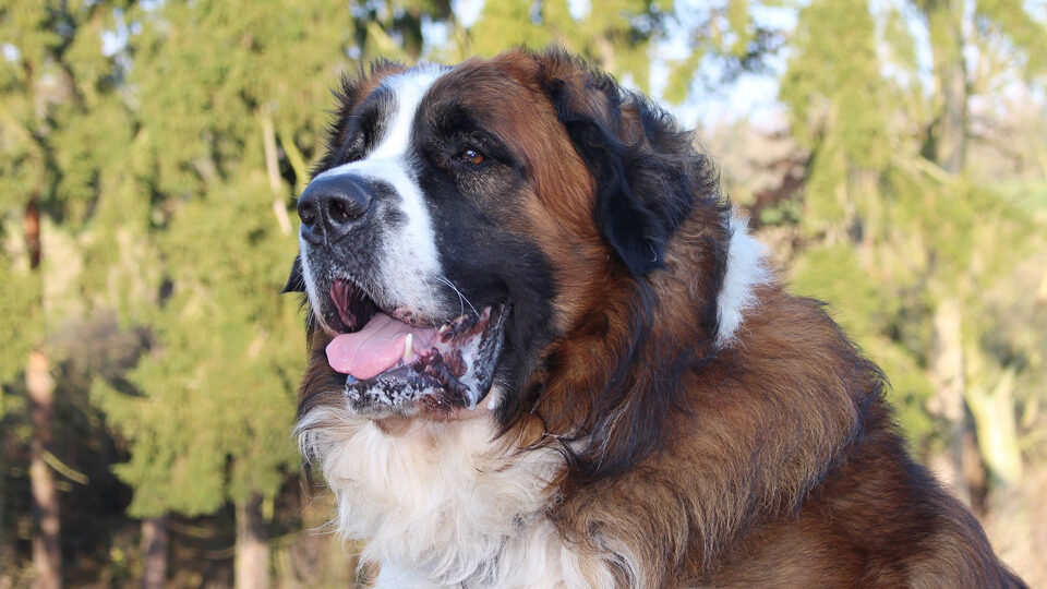 Окрас практически такой же, как у сенбернаров: черно-рыжая морда с белой полосой посередине, белое туловище с рыжими пятнами на спине, конец хвоста всегда белый.