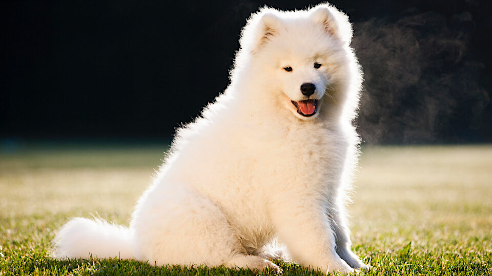 Название породы произошло от названия племен жителей Севера – Самоедов. Эти люди передвигались на санках по снегу, которые тянули белые собаки. Из-за окраса животных было не видно в снегу, и казалась, что сани едут сами. Отсюда и название (само-ед).