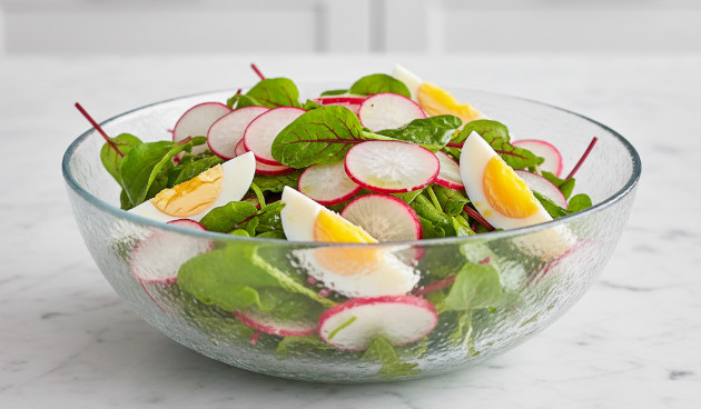 Нарежем соломкой яйца, редис и щавель. Ингредиенты перемешаем, посолим и заправим майонезом.