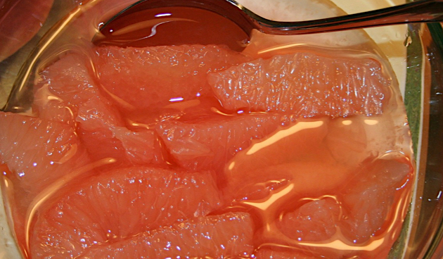 Разрезать грейпфрут пополам, надрезать кожуру ножом, чтобы раскрыть дольки, но не вынимать их. Положить в середину чайную ложку сливочного масла, сверху полить медом и запечь в духовке или на гриле до золотистого цвета при температуре 180 градусов. Подавать с шариком ванильного мороженного.