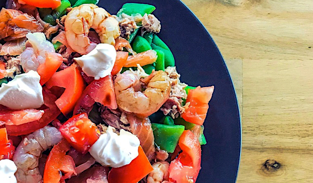 Низкокалорийный салат подойдет на ужин или как дополнительное блюдо к супу на обед. Креветки можно заменить на рыбу, куриную грудку.