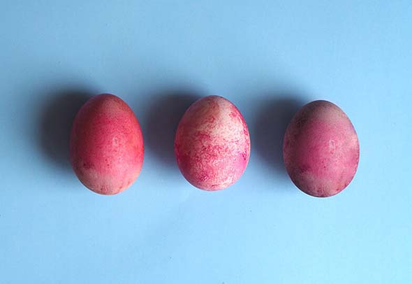 Понадобятся: сваренные вкрутую яйца, красящий отвар, бумажные полотенца. Вареное яйцо подержите в отваре 15 мин. Достаньте и произвольно протрите салфеткой в разных местах. Для более сложного эффекта подержите яйцо в растворе еще 20 мин. и вновь протрите салфеткой уже в других местах. Повторите предыдущее действие еще 2–3 раза. Экспериментируйте с цветами: красиво смотрится одна цветовая гамма с разной тональностью.