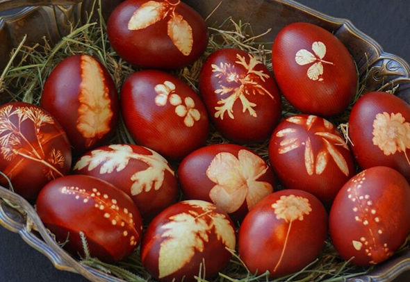 Пожалуй, луковая шелуха — самый известный натуральный краситель, доступный каждому. Из желтой получится более светлый оттенок, красная придает насыщенный цвет вплоть до бордового. На цветном фоне эффектно смотрятся оттиски растений: они остаются неокрашенными