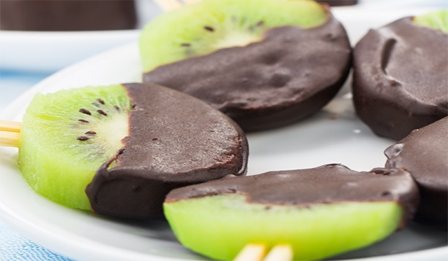 Киви очистить от кожуры и порезать на толстые кружочки (примерно по 8 мм). Вставить в каждый кружочек палочку и обмакнуть киви в растопленный шоколад до середины.