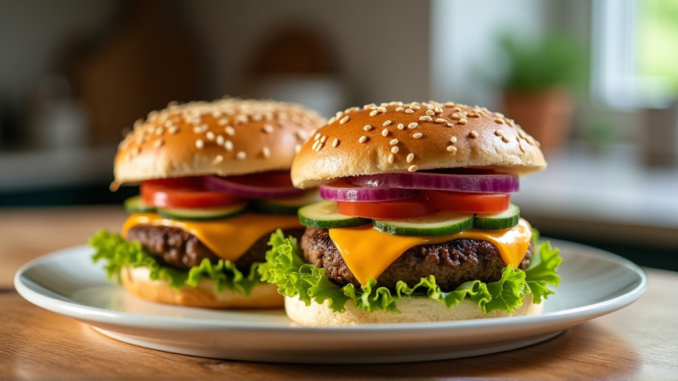 Шаг 3/3Выкладываем начинкуРазрезаем булочки вдоль. На одну половинку кладем листья салата, затем дольки помидоров, лук и котлету. Ломтики сыра помещаем на горячую сторону котлеты, чтобы они расплавились. Добавляем кусочки огурца, накрываем начинку второй половинкой булочки и слегка придавливаем.