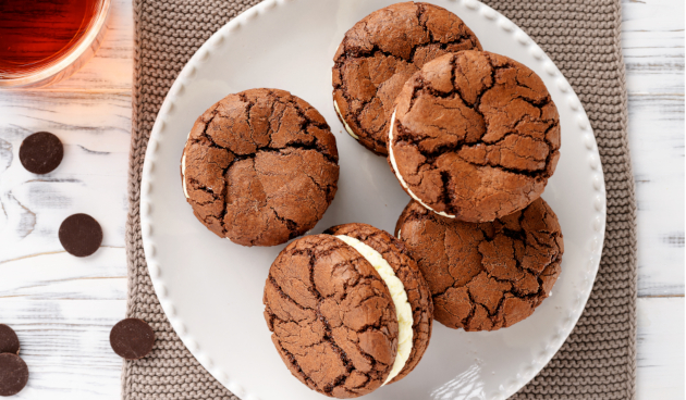 - На одно печенье выложите по 1 чайной ложке крема и накройте вторым печеньем, формируя сэндвич. Посыпьте сверху смесью из какао и сахарной пудры.