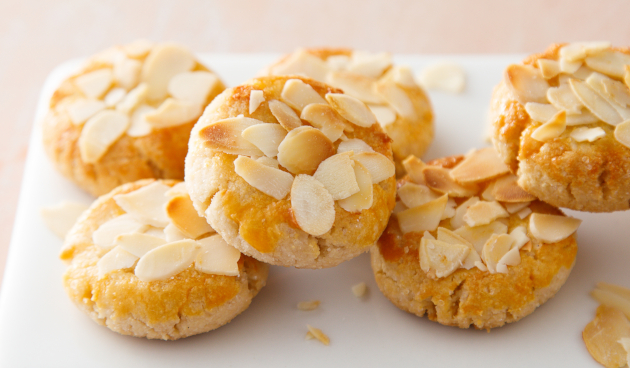 - Выложите кружочки на противень, застеленный бумагой для выпечки. Посыпьте миндальными лепестками. Выпекайте около 15 мин. в духовке, разогретой до 150 °C. Как только печенье слегка подрумянится — доставайте.