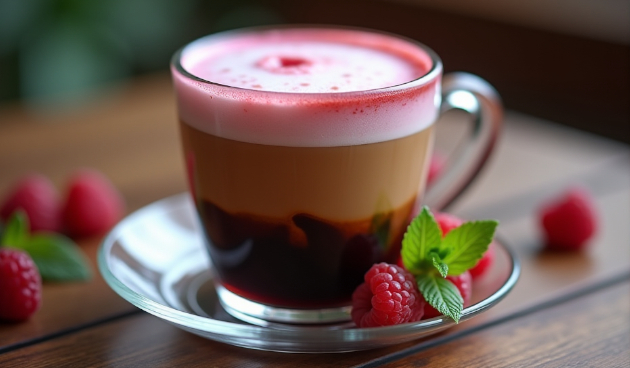 Соедините кофе и сливочно‑малиновую смесь в питчере, взбейте до пенки. Перелейте в бокал, при желании украсьте ягодой.