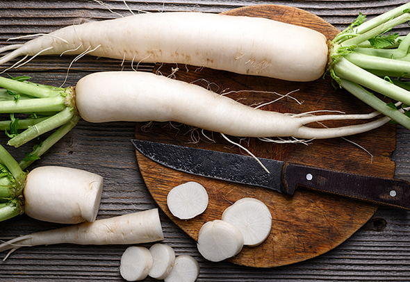 В Азии, особенно в Японии, очень популярен дайкон – белая разновидность редьки. Дайкон практически не горчит, может вырастать до гигантских размеров и весить до 15 килограмм. С японского он так и переводится: «большой корень».