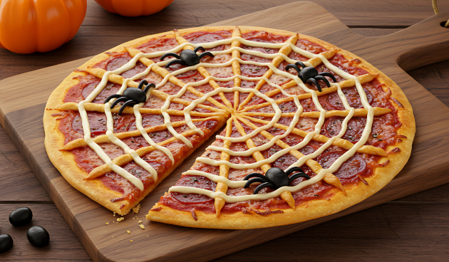 - Украсьте готовую пиццу «пауками» из маслин. Одну маслину разрежьте пополам, половинка будет туловищем. Вторую половину маслины разрежьте вдоль, это будет голова паука. Остатки маслины нарежьте тонкими полосками, это будут лапки. Разложите «насекомых» на пицце.