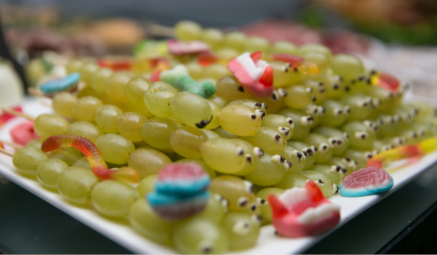 | Главное — специфический дизайн и необычная подача. | Поиграйте с формой — оживите блюда: ● обычные сосиски превратите в пальцы ведьмы; ● из яйца сделайте глазное яблоко, а из оливок — пауков. Добавьте жуткие текстуры: ● расплавленный сыр и зеленое желе создаст эффект слюней и слизи; ● кетчуп, соевый соус и красное варенье похожи на кровь. Замените обычную посуду на: ● мензурки и колбы; ● тыквы; Из черного хлеба можно слепить гробы и воткнуть туда печенье-пальцы и т. д. |