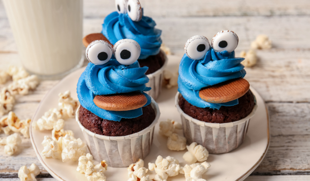 - Разогрейте духовку до 180 °C и выпекайте кексы около 15 минут, пока они не увеличатся в объеме. Готовые кексы остудите, а затем украсьте с помощью растопленного белого и темного шоколада, а также сгущенки. Белым шоколадом сделайте «глаза», а темным добавьте выразительность «рту».