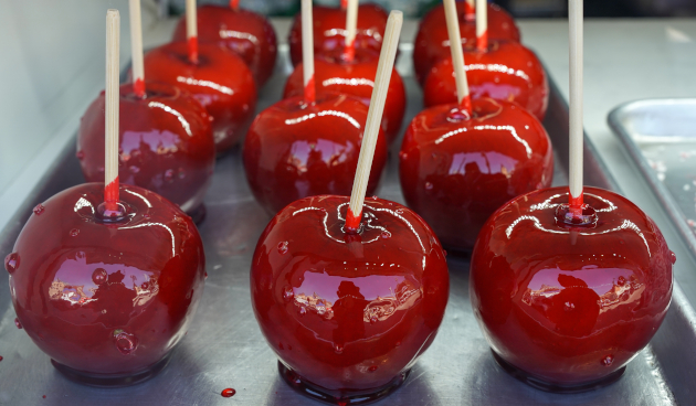 - Установите карамельные яблоки на лист фольги или воткните в высокий стакан, чтобы они держались вертикально. Пока карамель еще теплая и не застыла, можно украсить яблоки кондитерской посыпкой или кунжутом. Оставьте яблоки до полного застывания, чтобы глазурь стала плотной и блестящей.