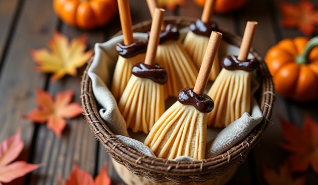 - Растопите темный шоколад с оставшимся сливочным маслом. Это можно сделать на водяной бане или в микроволновке. Залейте растопленным шоколадом место соединения соломки с тестом. Дайте шоколаду застыть и нанесите тонкие полоски сгущенным молоком, чтобы «обвязать метлу».