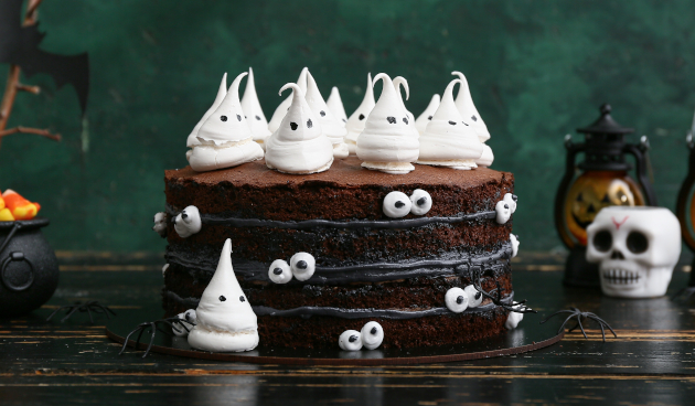 - Незадолго до подачи украсьте торт «привидениями». На остывших безе с помощью зубочистки и растопленного темного шоколада аккуратно нарисуйте глаза и рты, придавая фигуркам жутковатые выражения. Затем зафиксируйте безе на поверхности торта, используя немного жидкого шоколада в качестве «клея».