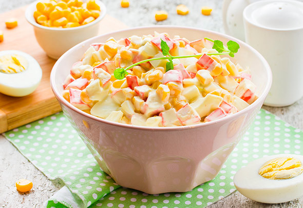 Промойте рис, выложите в кипящую воду, слегка посолите и варите до готовности, примерно 15–20 минут. Выключите огонь и оставьте под крышкой еще на 10 минут. Отварите яйца, очистите и измельчите привычным способом. Откройте банку с кукурузой и слейте сок. Нарежьте крабовые палочки средними кубиками, лук — мелкими. Соедините все компоненты вместе, заправьте майонезом и посолите по вкусу.