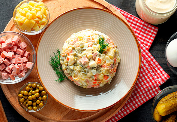 ● Не теряет своей актуальности и салат оливье, уже давно ставший символом новогоднего застолья.