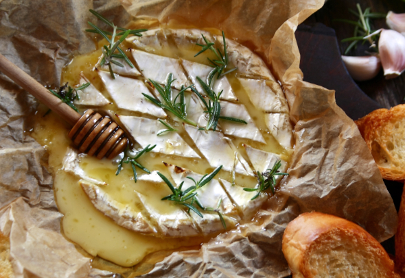 - Нарежьте сыры: камамбер — дольками, чеддер — кубиками.