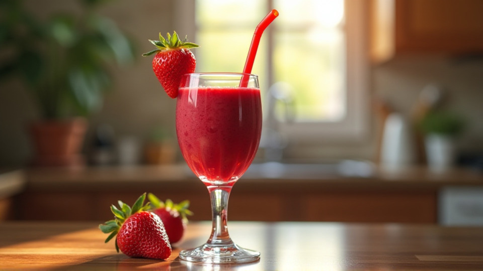 Шаг 3/3Готовим смузиВзбиваем ягоды с соком блендером. Получившийся смузи переливаем в бокал и украшаем его клубникой.