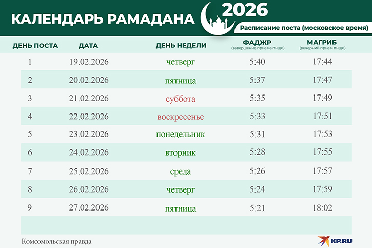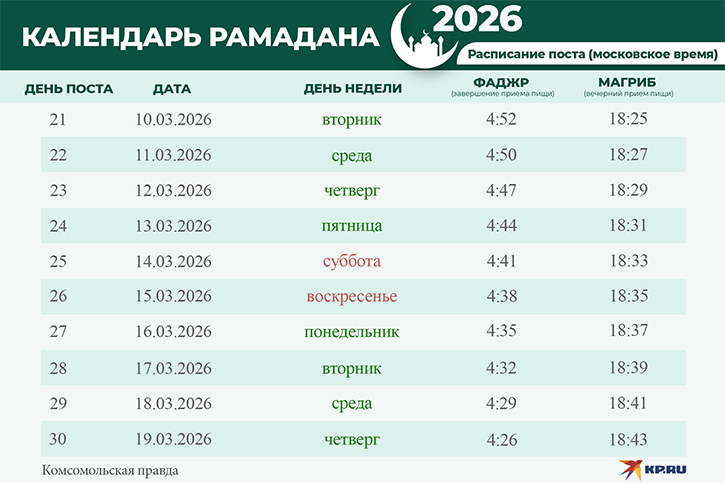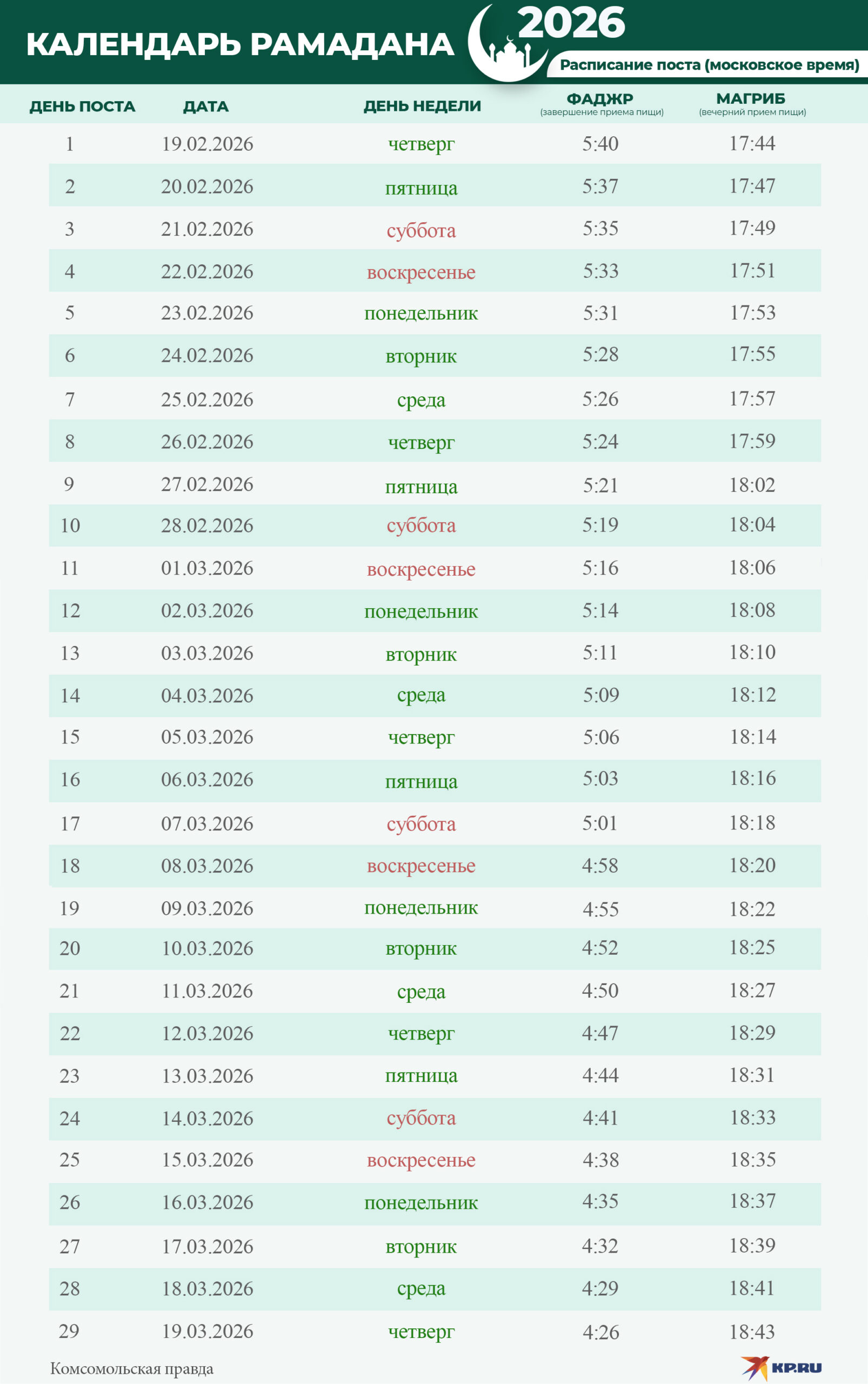 Календарь и расписание сухура для Москвы на Рамадан 2026 год