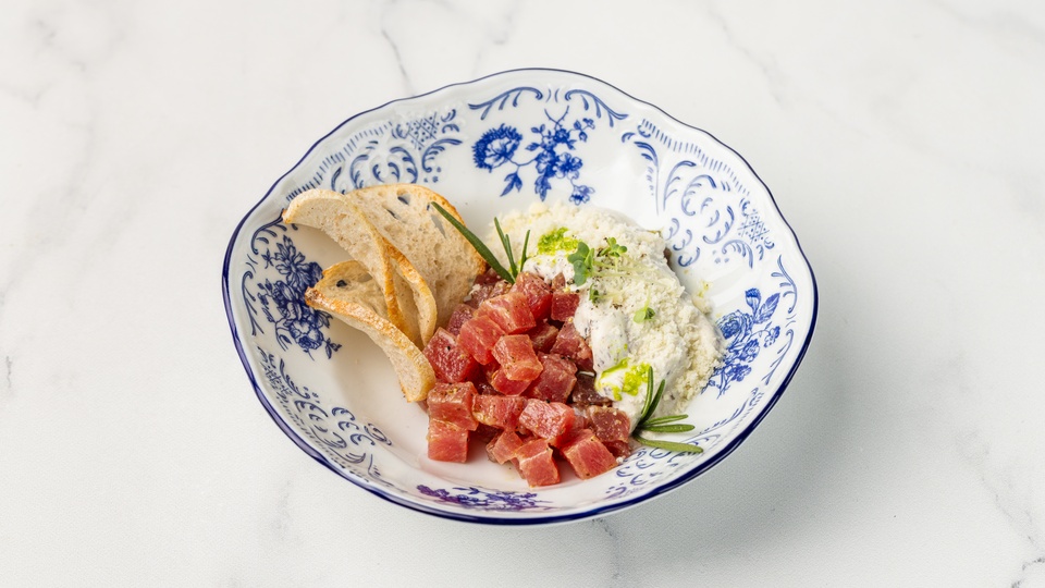 Шаг 3/3Подаем к столуУкрашаем тартар розмарином и оформляем блюдо хрустящими гренками из багета.