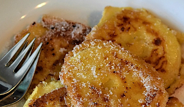 Жарить в небольшом количестве подсолнечного масла на среднем огне. Перевернуть на другую сторону, как только зарумянится первая. Подавать со сметаной и корицей.