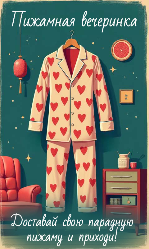Приглашаем тебя окунуться в атмосферу прошлого на нашей ретро пижамной вечеринке! Надевай винтажную пижаму или стилизованную под старину домашнюю одежду и готовься к путешествию во времени. Нас ждут классические фильмы, музыка прошлых десятилетий, традиционные игры и угощения по бабушкиным рецептам. Будем танцевать под старые хиты, играть в фанты и делиться историями. Обещаем вечер, полный ностальгии, теплоты и удивительных открытий о прекрасном прошлом.