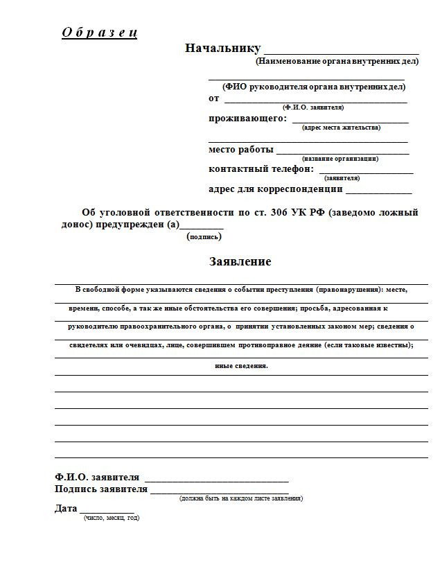 — В шапке заявления нужно указать: кому (начальнику отдела полиции) и от кого, — говорит наш эксперт. — Далее в тексте подробно описать произошедшее: дата, время, место, обстоятельства (кто, как, чем бил), указать данные виновного и свидетелей, описание травм. В конце добавить просьбу о привлечении виновного (виновных) к уголовной ответственности. И приложить медицинское заключение.