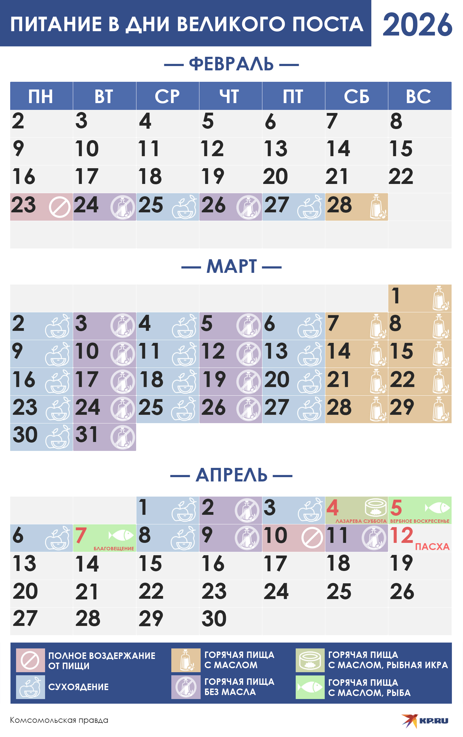 Как и раньше, понедельник, среда и пятница — это дни «сухоядения». Это означает, что верующие употребляют пищу без термической обработки. Во вторник и четверг разрешены тушеные и отварные блюда без масла. В субботу и воскресенье можно есть горячую пищу, приправленную небольшим количеством растительного масла.