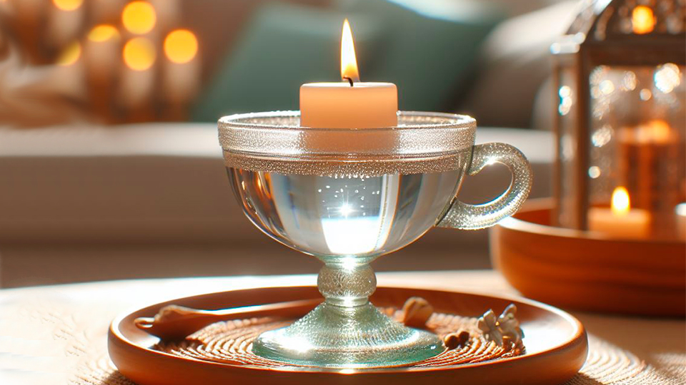 - справа от чаши нужно поставить зажженную свечу, так как огонь — это портал, открывающий врата в другие измерения, он же выполняет защитную функцию во время гадания;