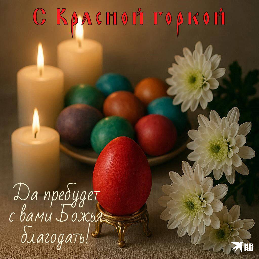 - Для знакомых. Подойдут универсальные красивые открытки с яркими картинками, где есть голуби, свечи, крашенные яйца. Текст без личных обращений, нейтральный: «С Красной горкой! Радости и душевного тепла».