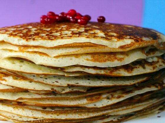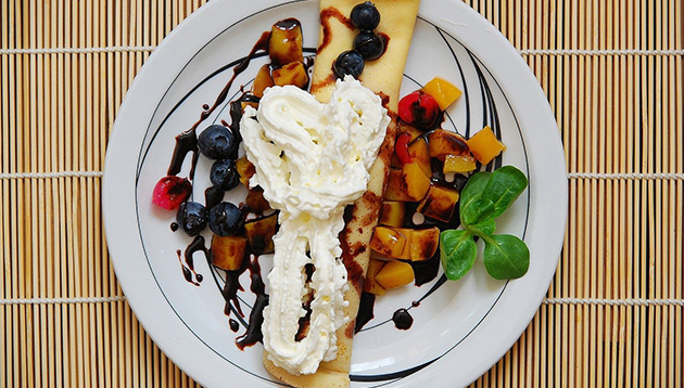 Яйца, молоко, сахар и соль тщательно перемешиваем до однородной массы. Добавляем муку, растительное масло и замешиваем тесто. Выпекаем по традиции на раскаленной сковороде, а затем охлаждаем. Переходим к необычной начинке: творожный сыр взбиваем с половиной порции сливок и 1 столовой ложкой меда. Каждый блин смазываем получившейся начинкой, сворачиваем трубочкой и разрезаем на 5 ровных частей. Затем раскладываем их по широким бокалам. Оставшиеся сливки взбиваем и выкладываем в бокалы — сверху на блины. Украшаем целыми ягодами клюквы и поливаем медом.