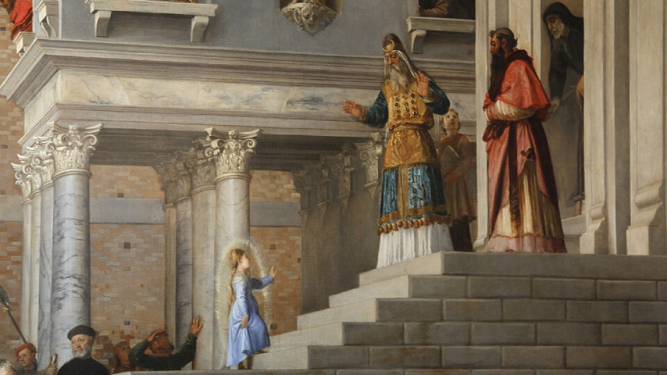 Иоаким и Анна, будущие родители Пресвятой Богородицы, много времени провели в молитвах о рождении ребенка. Они пообещали Господу, что если родится ребенок – они отдадут его на служение Богу. В скором времени их просьбы исполнились, и появилась на свет Мария. Когда девочке исполнилось три года, родители собрались исполнить данное обещание. Одели дочь в красивые одежды, созвали всех родственников и, распевая священные песни и держа в руках зажженные свечи, выдвинулись из Назарета в Иерусалим. Через три дня пришли они к храму, где встретил их первосвященник Захария (по преданию – отец Иоанна Крестителя) с другими священниками.