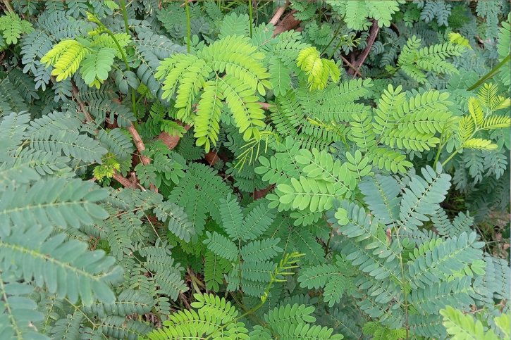 Листья на длинных черешках, сложные, дважды перистые, с 15 – 30 парами реснитчатых листочков. Они легкие и изящные, трепещут даже при слабом ветерке, а в жару и на ночь складываются по срединной жилке. Листовые пластинки сверху зеленые, а снизу сизые, что добавляет игры цвета. Осенью листья становятся лимонно-желтыми.