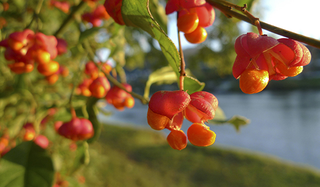 Бересклет европейский (Euonimus euoropaeus). Высокий кустарник или небольшое деревце до 5 м с рыхлой кроной диаметром до 3 м. Молодые побеги зеленые четырехгранные с продольными пробковыми ребрами. Кора взрослых ветвей темно-коричневая, почти черная. Листья крупные, яйцевидные, гладкие, темно-зеленые, осенью – багряные. Цветет в июне многочисленными зеленовато-белыми цветками, собранными в соцветия-зонтики. Плоды – повисающие четырехстворчатые коробочки – темно-красные или розовые. При созревании (сентябрь-октябрь) они лопаются, обнажая семя, целиком покрытое сочным оранжевым присемянником.