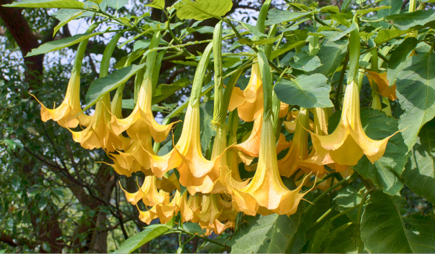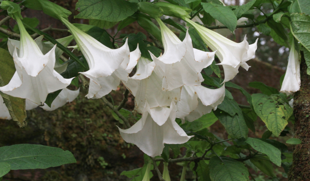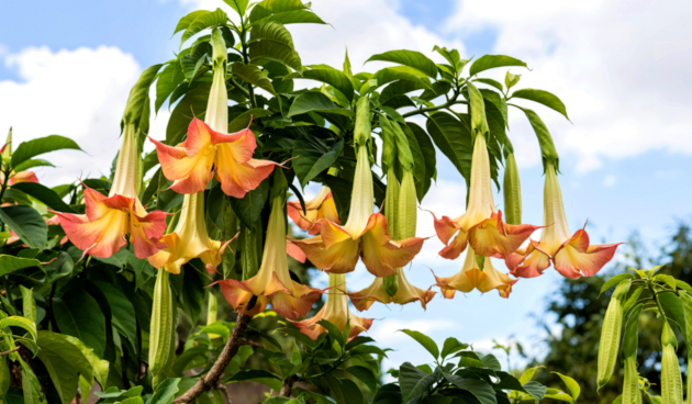 Бругмансия белоснежная (Brugmansia candida). Чаще это небольшое компактное деревце с низко растущими побегами, хотя в природе она может достигать высоты 5 м. Несмотря на название, цветки бывают не только белые, но и желтые, абрикосовые, лососевые, коралловые.