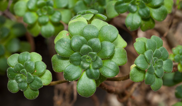 Это компактный кустарничек высотой до 25 см – ампельное или почвопокровное растение. Стебли у него тонкие, ветвящиеся, полегающие. Розетки многочисленные, небольшие – диаметром 2 – 4 см, плотные. Листья внешне похожи на листья очитка (седума). Они мелкие, длиной около 1 см, яйцевидные, мясистые, зеленые с красноватыми полосками или крапинками, на солнце могут краснеть.