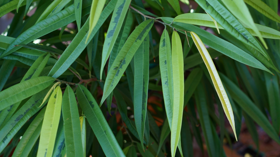 В природе это относительно небольшое дерево высотой до 10 м. Листья кожистые, темно-зеленые. Внешне очень похожи на листочки ивы: узкие – шириной обычно около 1 см, но длинные – могут достигать 24 см (1). Но в домашних условиях он, разумеется, скромнее – в пределах 1 – 2 м.