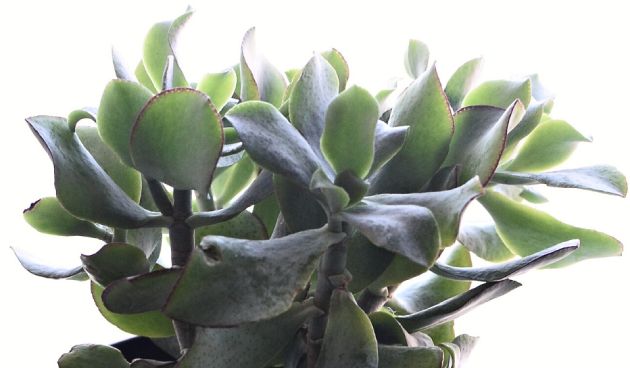 Крассула древовидная (Crassula arborescens). Внешне похожа на крассулу яйцевидную: мощный ствол и голые ветки, листья мясистые плоские округлые сероватые с бледно-голубым отливом и красной каймой. Цветки белые или розовые, но цветет в комнатных условиях крайне редко. Любит яркое солнце (1).