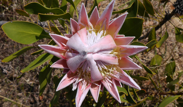 Главное украшение растения – огромный цветок, до 30 см в диаметре. С ботанической точки зрения, это не один, а множество цветов, собранных в соцветие и окруженных прицветниками (2). Центр соцветия (то есть сами цветы) окрашен в бледно-розовый цвет, а прицветники – в более яркий (3). Больше всего ценятся протеи с серебристо-розовыми прицветниками.