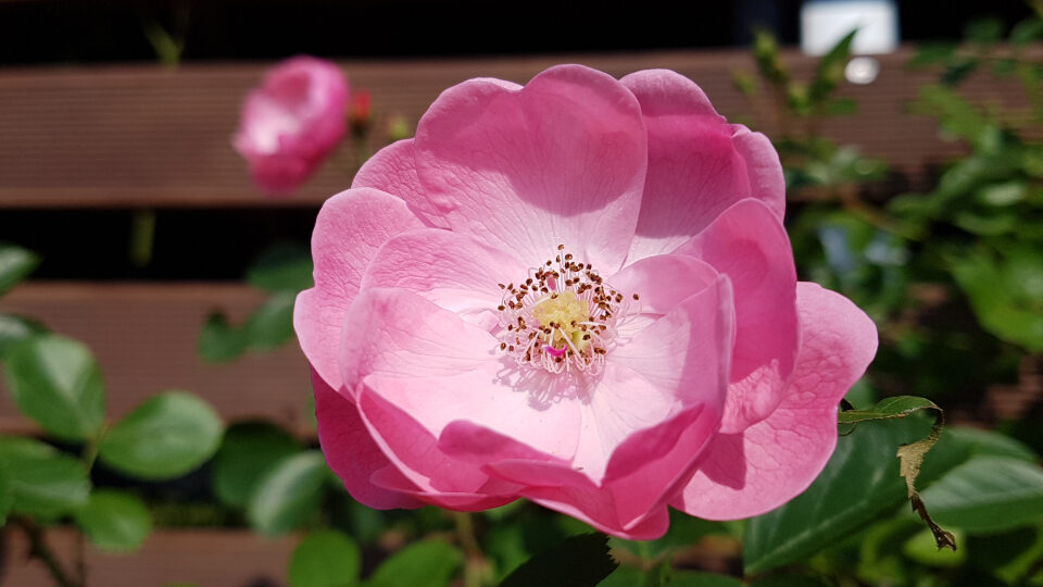 Этот сорт восхищает сразу по многим параметрам. Цветки у нее полумахровые, диаметром около 6 см, бледно-розовые внутри и с насыщенным малиновым оттенком снаружи на внешней стороне лепестков. Венчики никогда не раскрываются полностью и имеют форму глубокой чаши, что у роз встречается очень редко. Цветки собраны в большие плотные кисти от 5 до 20 штук в каждой. А бывает, что в кисти и 27 цветков! Каждый цветок держится около 2 недель, отдельная кисть цветет до 3 недель, а куст в целом – целый месяц. Аромат у нее слабый (1), с фруктовыми нотками.
