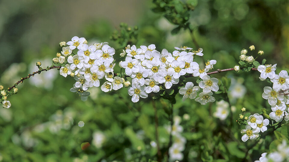 Graciosa – кустарник высотой до 2 м с раскидистой кроной и ниспадающими побегами, цветет продолжительно белыми цветками на прошлогодних побегах. За обильное и длительное цветение его называют Майской пеной.