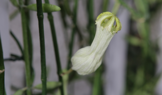 Все растение имеет необычный облик, но более всего поражают цветы церопегии Арманди. Ярко-зеленые лепестки напоминают трубочки и срастаются над венчиком, образуя некую воздушную конструкцию в форме круглой клетки (3).
